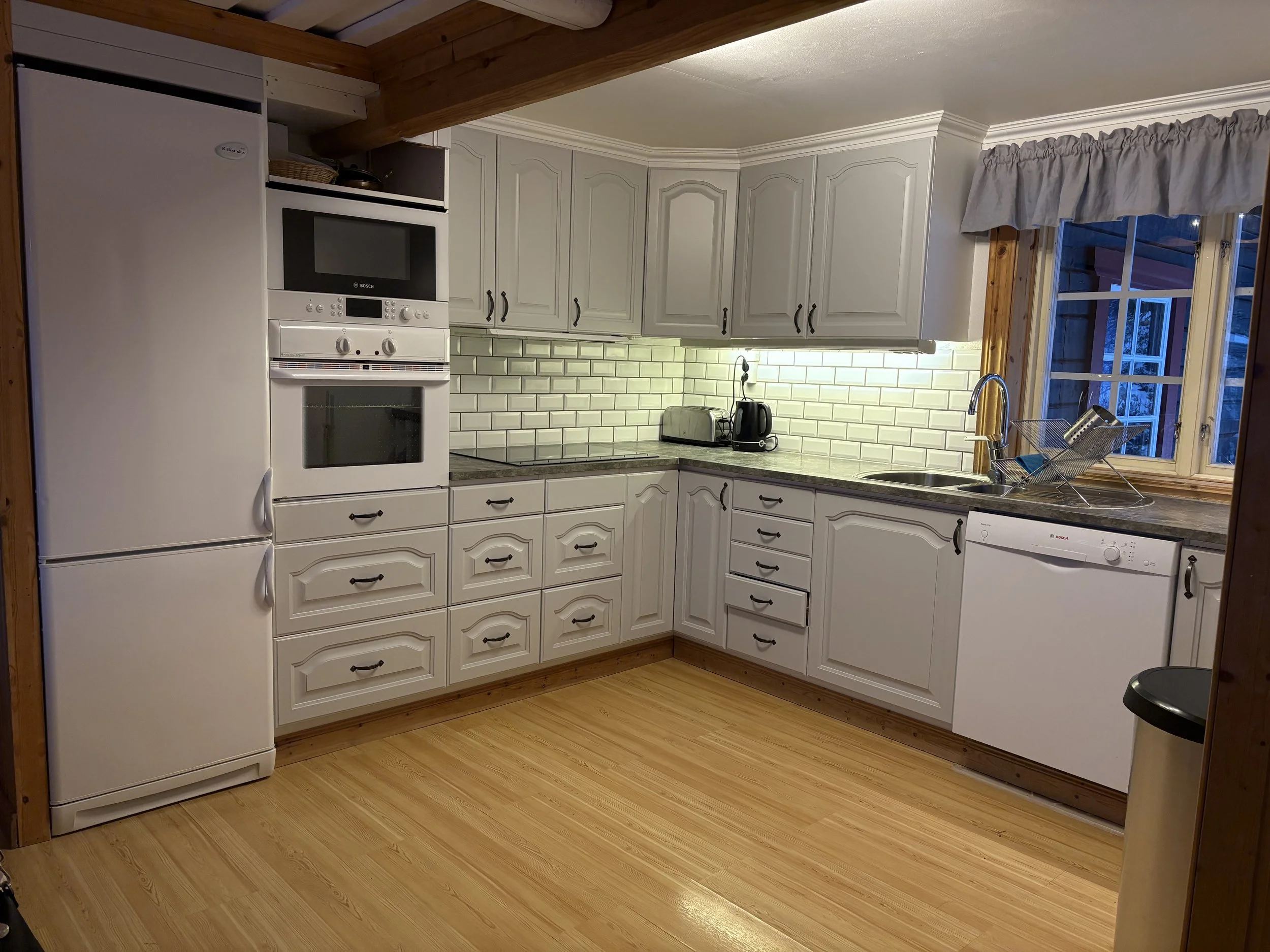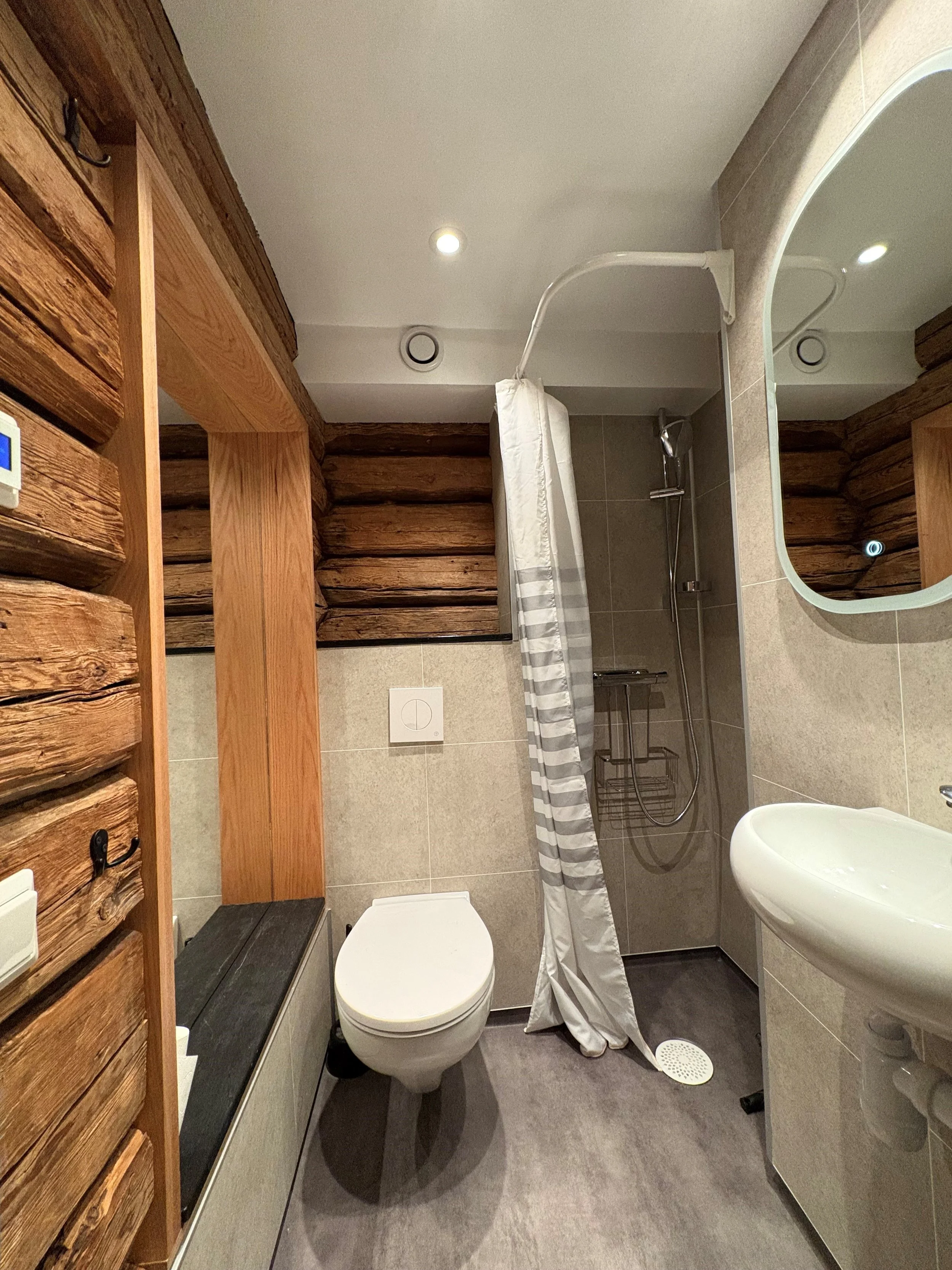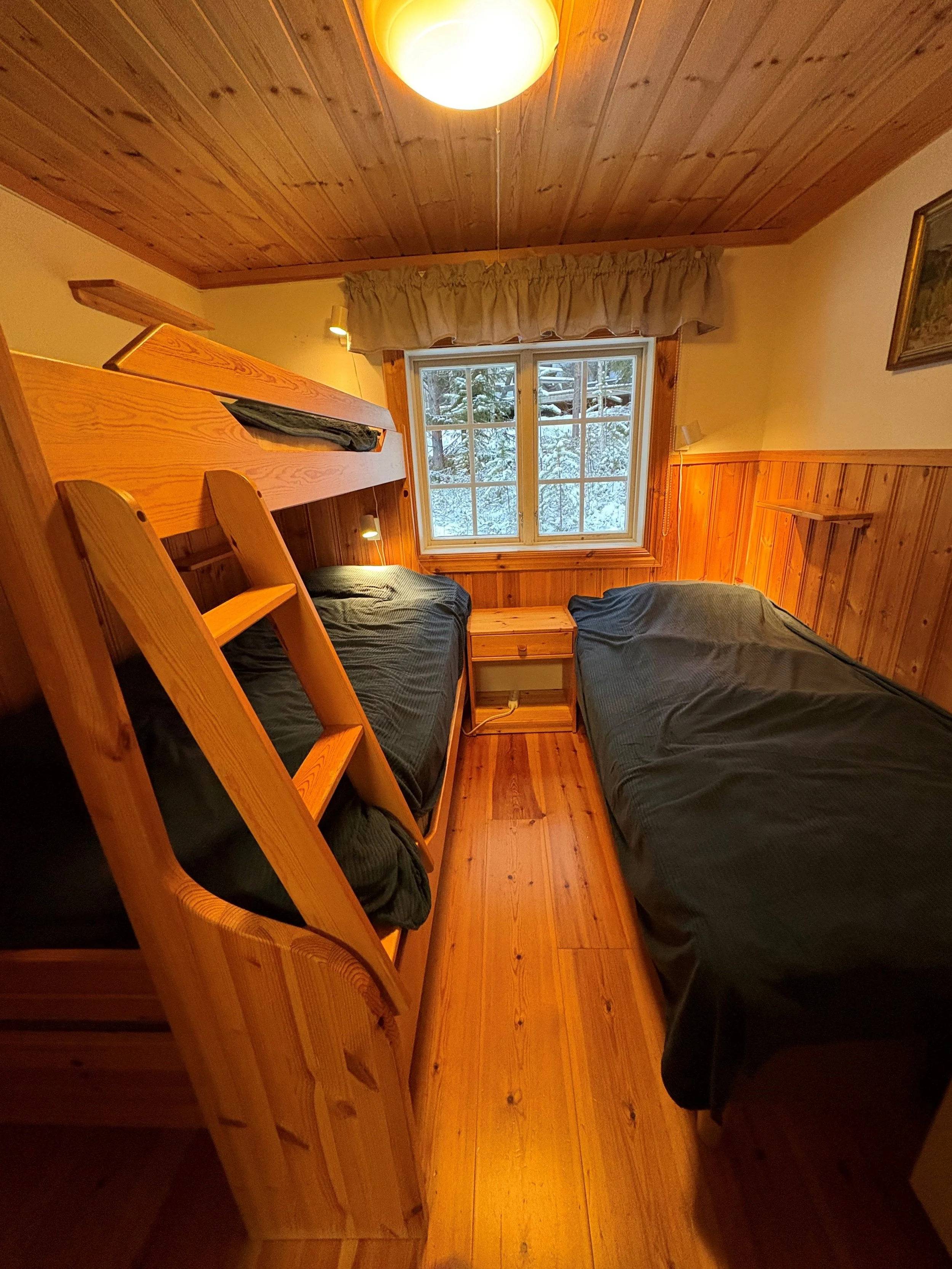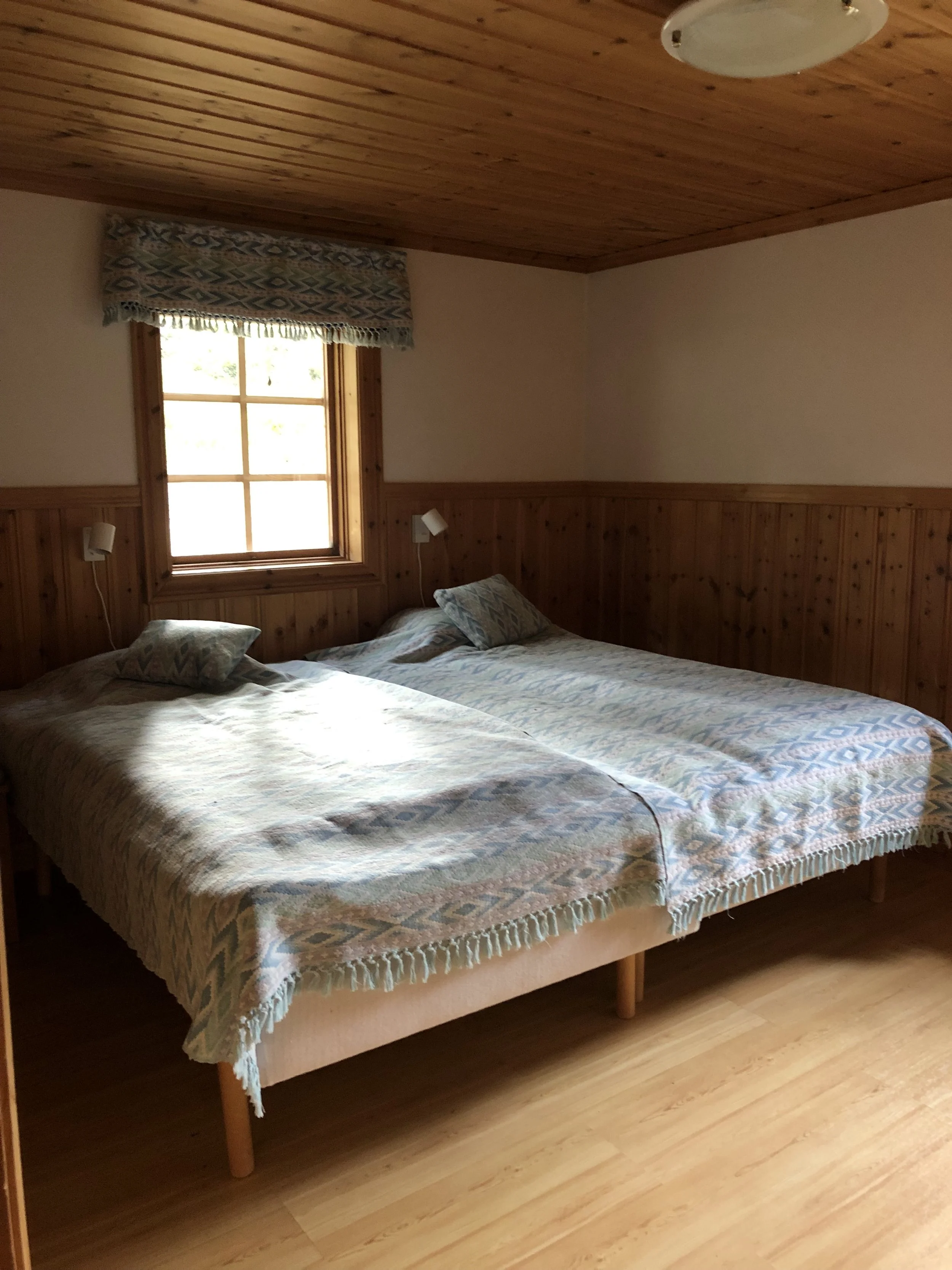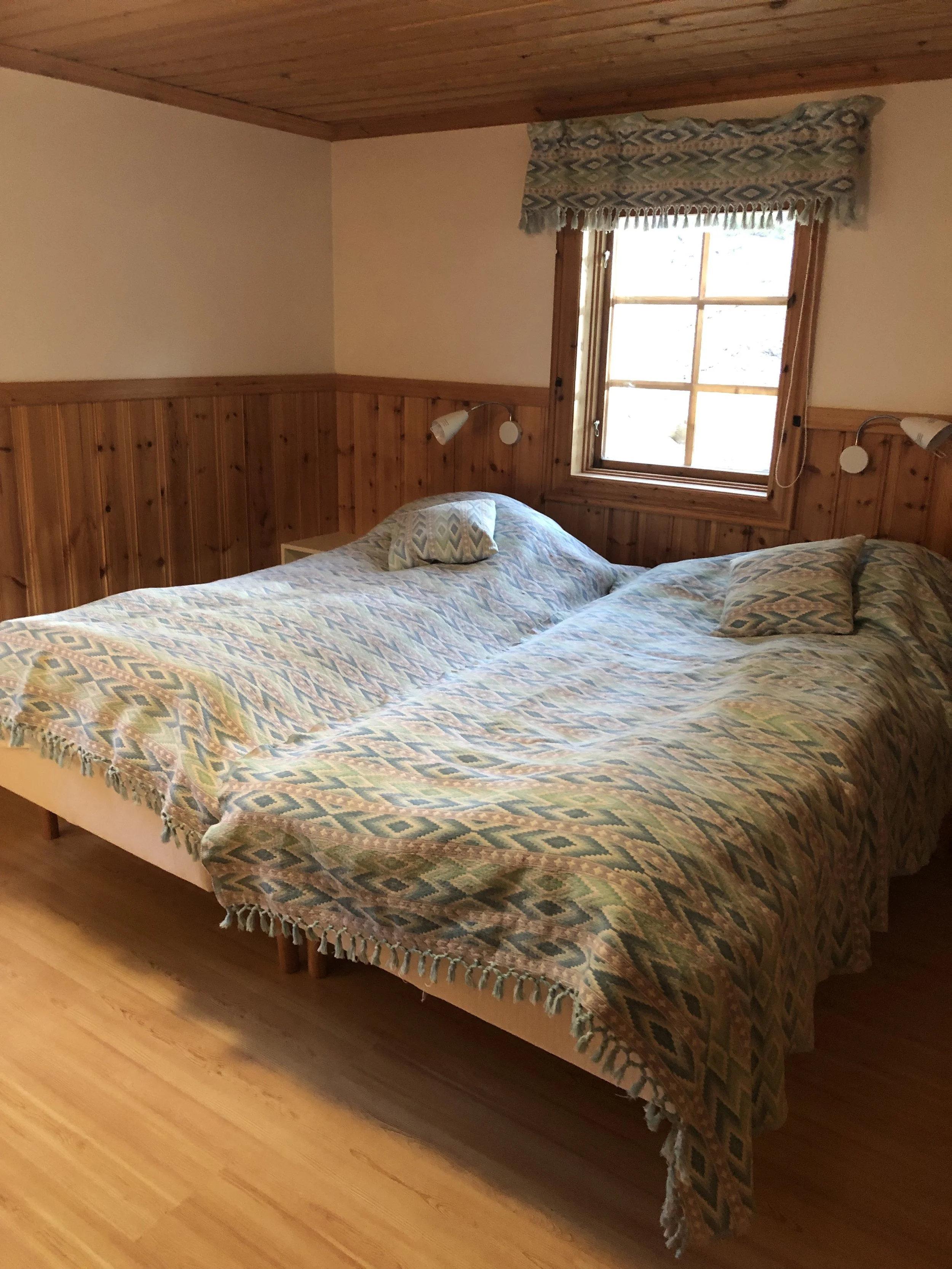 Stugan har en stor rymlig matplats för ca 10 personer, 4 sovrum med 9 sängplatser, rymlig storstuga med timmerväggar, takbjälkar och öppen spis. Stugan har ett badrum med dusch och wc, ett separat wc samt bastu med dusch. Det är två stora sovrum med dubbelsäng (2*105 cm), samt ett med våningssäng och ett med våningssäng plus en 90 cm säng.
